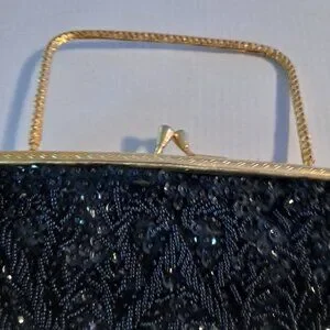 Features: floral leaf motif, gold toned metal frame and kiss lock closure; lined in satin, small inner pocket, bottom scalloped edge