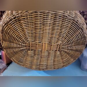 Charming vintage wicker basket with a red white checkered liner and matching stuffed bow. Perfect for decor or storage. In excellent condition no breakage. measures 19x12x7.5