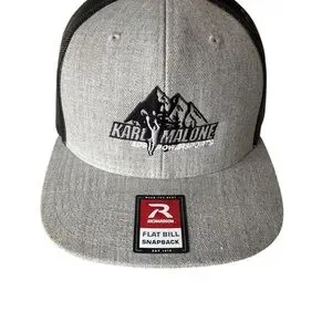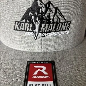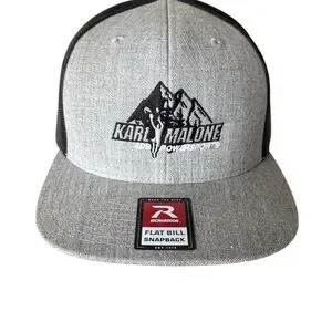 Karl Malone flat bill nwt snap back trucker hat. ADS Power Sports. Gray and Black. 6 panel. Gray/silver look front panel has a textured or tweed look to it. Rest is black. Richardson style 511. Displayed only not used. Slight sun discoloration(?) on right side of bill but hardly noticeable. Just wanted to mention it. Sleek attractive style hat. Malone played for Utah Jazz and Los Angeles Lakers.