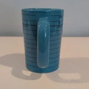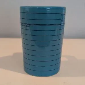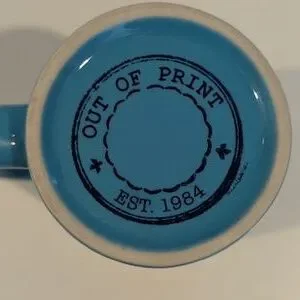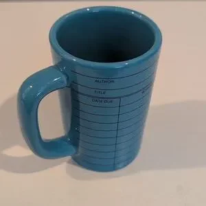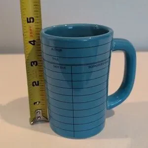 Out Of Print 12 Ounce Library Card Ceramic Coffee / Tea Mug. Beautiful blue mug with Library Card print in dark blue. Author, Title, Date Due and Borrowers Name printed on both sides of mug. Mug holds 12 fluid ounces. Mug measures 4 5/8 inches high, 3 1/8 diameter with an additional 1 3/8 inch handle. Mug is in excellent used condition, no chips or cracks. Please see photos for details and measurements.