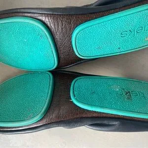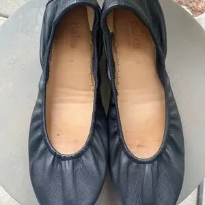 ⭐️ Mother’s Day Sale! Tieks Italian leather black ballet flats. Teal split sole and teal accents. Stretches to fit. Some slight scuffing on the heels, see photos. Flats can fold up for travel. Comes with travel pouch and nylon tote bag. Very good used condition.