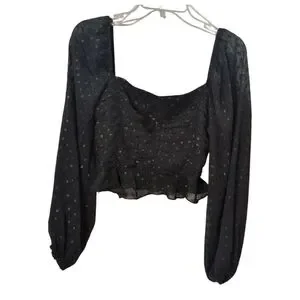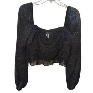 Lulu's Totally Charmed Black Ruched Clip Dot Balloon Sleeve Top Size Small