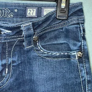 These are pre-owned Miss Me brand jeans, size 27, model JE5341S12R, with a skinny fit. The dark wash denim features decorative stitching and embellishments on the front and back pockets. The jeans have a standard five-pocket design with button and zipper closure. There are no immediately visible stains, tears, or significant wear, but as a pre-owned item, minor imperfections may be present.