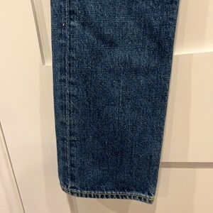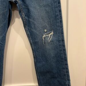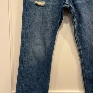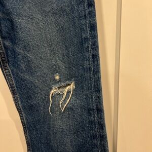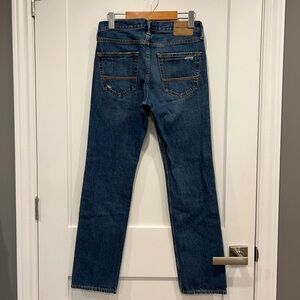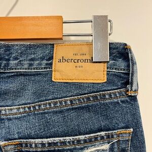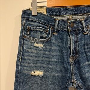 These Abercrombie & Fitch jeans feature a trendy skinny leg cut in a timeless blue hue, enhanced by intentional distressing for a vintage look. The denim showcases a medium-dark wash with natural fading, offering a stylish and lived-in appearance. Not sure if these were worn or not, excellent condition.