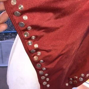 Very cool retro suit in rust color and adorned with shiny gold discs that reflect light beautifully.