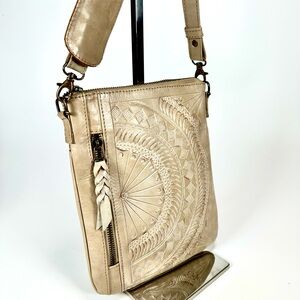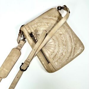 The image shows a hand-tooled leather medallion crossbody bag, likely made of light-colored leather. The bag features a prominent circular medallion design in the center, surrounded by geometric patterns and decorative stitching. The bag also has a braided strap and a zipper closure. The leather appears to be embossed or tooled, giving it a textured and detailed look. If the leather becomes misshapen, it can be gently reshaped using low heat from a hairdryer or a handheld steamer. Once pliable, it can be molded back into shape and allowed to cool.