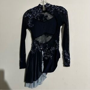 Stunning navy blue dance costume with floral embellishments. Features sheer panels and a unique asymmetrical design. Size Adult Small. Like New condition. No tears or stains. Smoke free home.