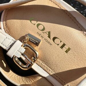 Elevate your summer look with these stunning Coach Henriette sandals, featuring delicate floral appliqué with rivet accents. A blend of elegance and comfort, these sandals in soft chalk white are perfect for sunny days, vacations, or brunch outings.