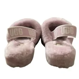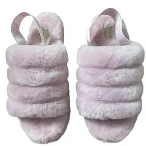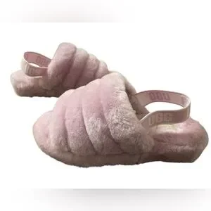 Cozy pink fluffy slide sandals with UGG branding. Perfect for lounging.