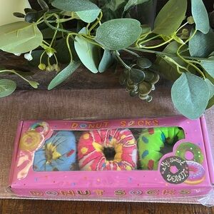 Cute Donut package set of three socks. Fun colors to brighten your day. Give your feet a sweet treat.