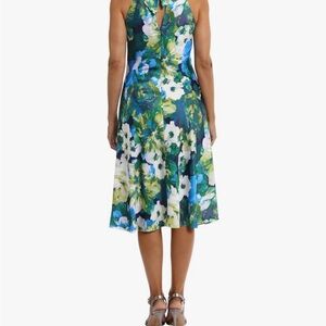 High mock neck band, feminine bow tie closure at center back neck, back keyhole opening, halter cut, sleeveless, loose non-fitted waist, and a midi length fit and flare skirt.