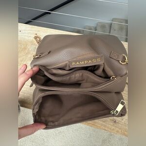 Rampage crossbody bag, taupe faux leather purse, gold chain handbag, edgy zip detail bag, trendy shoulder bag, versatile evening bag, compact stylish purse, street-style chic handbag.