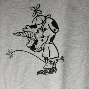 White tee featuring a vibrant graphic with pink, yellow, and gray accents. Bold and playful design.