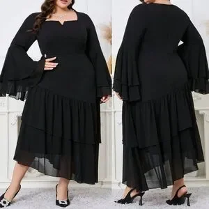 This stunning black dress features an asymmetrical, tiered design with ruffled details, perfect for a night out. The square neckline and bell sleeves add a touch of elegance, while the fit and flare style ensures a flattering silhouette. Ideal for cocktail occasions, this dress combines classic charm with modern flair.