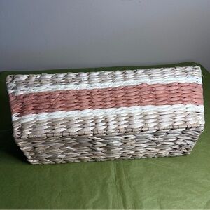 This beautifully crafted basket showcases a harmonious blend of tan, cream and terracotta color hues, perfect for adding a touch of charm to any space. Its sturdy handles and open-top design make it both functional and stylish, ideal for organizing or as a decorative accent. The intricate weave pattern enhances its visual appeal, making it a standout piece in your home decor.