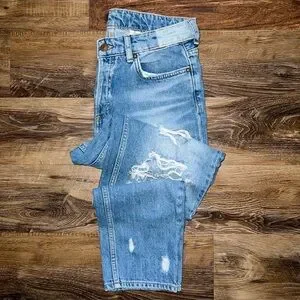 These light wash jeans feature a low waist fit and a straight leg, with significant distressing, large rips and tears on the thighs and knees. The jeans have a classic five-pocket design and 4 button closure.