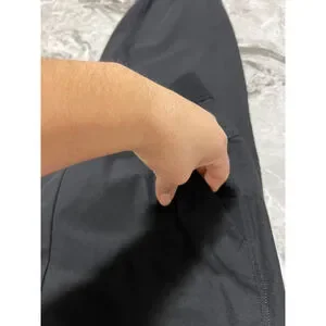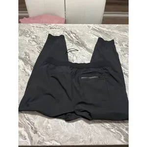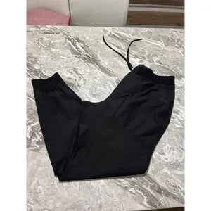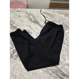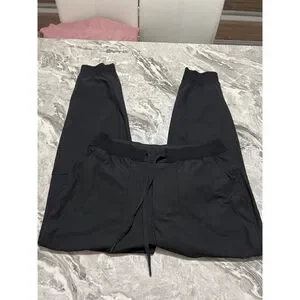 Pre-owned Lululemon ABC black joggers, size XL. Made of 100% polyester. Features an elastic waistband with drawstring, side pockets, and a zippered back pocket. The joggers show minimal signs of wear. Measurements are not provided.