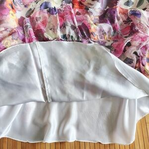 $498 Mac Duggal anthropologie dress floor length full sweep halter top big neckline flower rouched chiffon layer tier skirt white satin lined spring summer bohemian flower pattern feminine sexy elegant prom party wedding bridal parties formal dance pageant boho designer like new womens 14 pink orange yellow purple green flowing ruffles open back asym multi pleated bodice