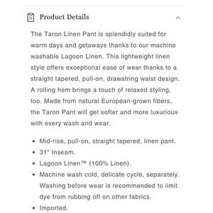 Description: Taron 100% linen drawstring pant hem can be cuffed or uncuffed