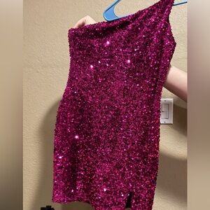Dazzle in this sparkling pink sequin one-shoulder dress. Perfect for a night out.