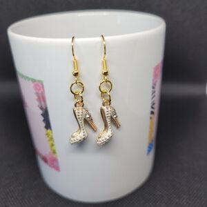 Elegant high heel earrings in gold and white, perfect for adding a touch of glamour to any outfit.