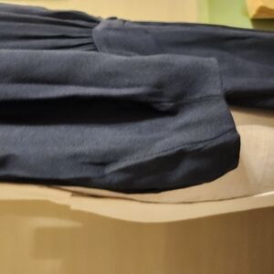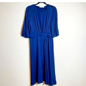 Step out in style with this elegant navy blue mid length, short sleeve dress from Ba&sh. Perfect for any occasion, it offers a chic and comfortable fit. It reminds me of a 1920s style. It features a beautiful and flattering crepe fabric, rounded neckline, two large navy blue buttons at left shoulder, short sleeves that are gathered at the shoulder, and cuff, a pleated waistband, and side zipper with a hook-n-eye closure. It has great flow. I would love to keep it. However, I need one size up. Ba&sh size 3 equals a US size 8.
