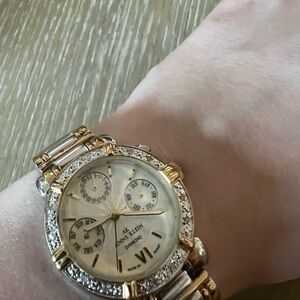 Experience timeless elegance with the Anne Klein watch, featuring a striking gold and silver metal link bracelet. The round case and multi-function face offer both style and practicality, while the sparkling bezel adds a touch of glamour.