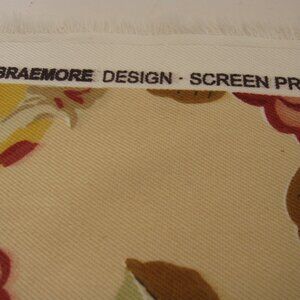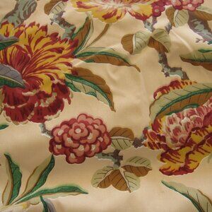 Bold beautiful floral in shades of red, yellow and green pastels on beige ground in 100% cotton. Upholstery/drapery weight from Braemore Fabrics, now discontinued.