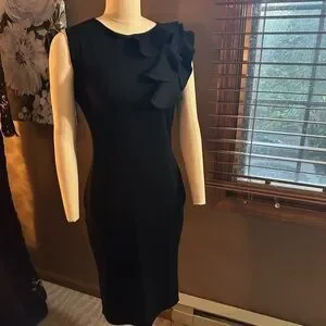 What makes this dress stand out are the cascading ruffles, which add a touch of femininity and class. The fabric is smooth and luxurious, giving the dress a formal and polished appearance. It strikes a balance between classic and contemporary, perfect for cocktail parties, formal events, or any occasion requiring an elegant look.