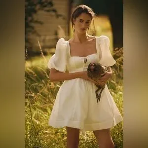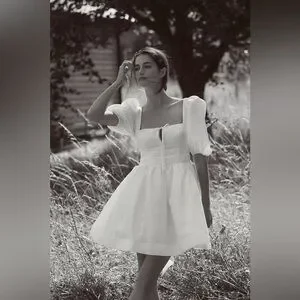 New with tags! Such a pretty and whimsical dress. Perfect for Spring and Summer. Trendy but also a classic beauty. Crafted from jacquard fabrication, puff sleeves, full mini skirt, and lace-up back. Womens size small.
