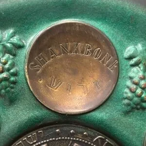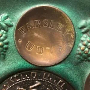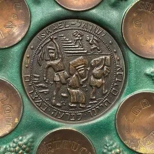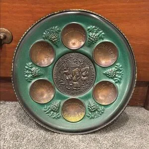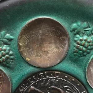 Beautiful vintage Seder plate with green and bronze tones. Features intricate designs and Hebrew inscriptions.