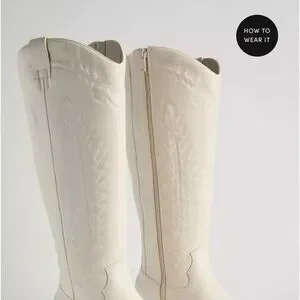 Elegant cream cowboy boots with intricate stitching. Features a side zipper for easy wear. Perfect for a stylish western look.
