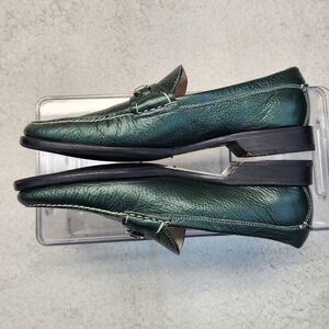 ■Stylish dark green leather Cole Haan loafers with a silver-toned horse-bit detail. These loafers are versatile, suitable for both professional and casual wear, and are appreciated for their style, comfort, and quality.