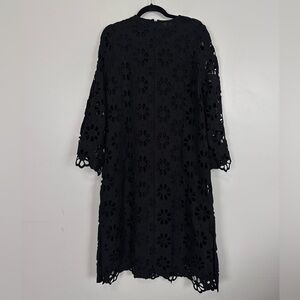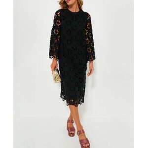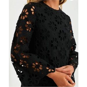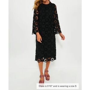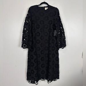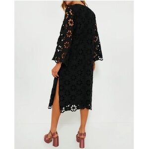 This best-selling silhouette is back in an updated look! The Noir Eyelet Hutton Dress is an elegant style perfect for date nights, dinner parties, and beyond. Featuring unlined floral lace bell sleeves, side slits for ease of movement, and an easy straight silhouette, this look can be styled hundreds of ways. Pair with heels and a clutch or ballet flats and a top-handle bag!