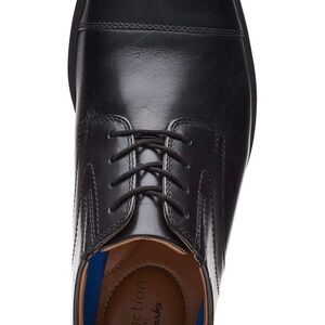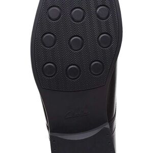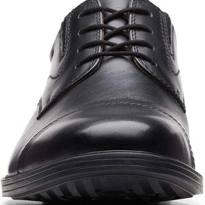 Experience timeless elegance with Clarks' black leather Oxfords, featuring a polished finish and traditional lace-up design. The durable sole and moderate heel height ensure comfort and style for any formal occasion. Meticulous stitching adds a touch of sophistication to these classic shoes.