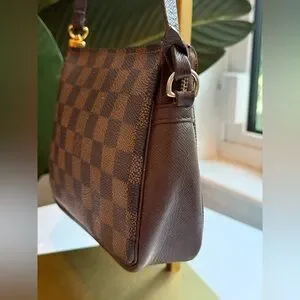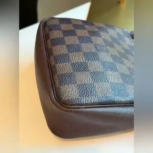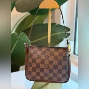 Louis Vuitton ‘Trousse’ Pochette in Damier Ebene. Interior has a pen mark in one corner. Canvas has lightest color rub on one square on the exterior not very noticeable. Bag charm not included.