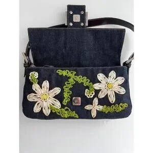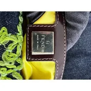 Vintage Fendi raffia raffia embroidered denim baguette