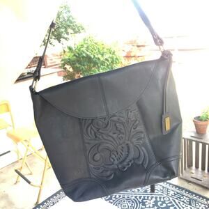 Born Flower Embossed Black Leather Purse Medium Bucket Hobo Western Boho Moto
