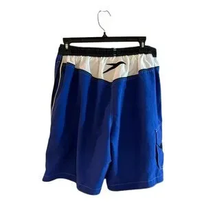 blue Speedo swim shorts with a black waistband and a white drawstring. A thin white stripe runs down the side of the shorts. These shorts are designed for swimming or other water activities, as suggested by the Speedo brand, which is known for its swimwear. Swim feature quick-drying fabric and a comfortable fit for use in and out of the water.
