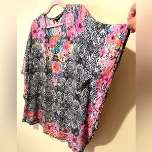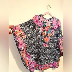 Tolani Collection Black/Pink Floral Boho Geometric Tunic/Poncho. Rayon. Size LP