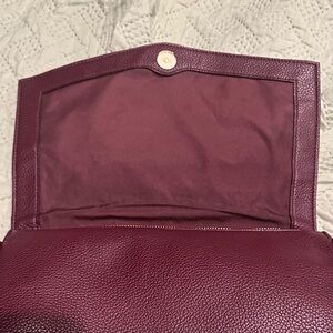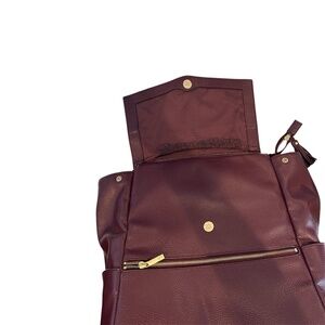 Beautiful pebbled leather burgundy/dark red diaper bag from Freshly Picked. Marker was used on the inside flap but has been mostly removed through cleaning - some faded markings may be visible, though not incredibly obvious. Lots of storage/pockets!