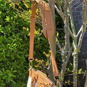 This Tory Burch tote bag features a sophisticated tan and cream color palette, perfect for adding a touch of elegance to any ensemble. Its structured design ensures durability and style, making it an ideal choice for both casual and formal occasions. The tote's spacious interior offers ample room for all your essentials, while the contrasting leather accents add a refined finish. Clean inside and out no callouts, barely used inside pockets can be worn with detachable shoulder strap or by using handles perfect for spring and summer.