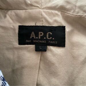 A. P. C. Navy checkered jacket. Shirt trench style. Pockets, hood. Large