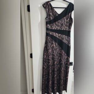 This elegant dress features a stunning black and pink lace design, perfect for any special occasion. The intricate lace pattern adds a touch of sophistication and style.