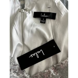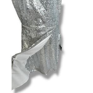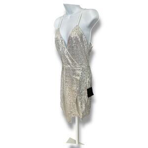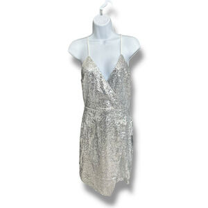 New Lulu's Hilaria Silver Sequin Bodycon Mini Halter Dress Faux Wrap Hem Small