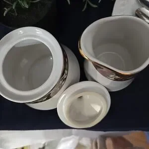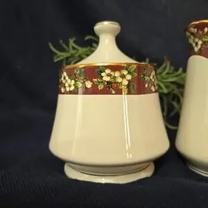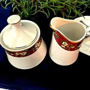 The Splendor by Sakura Sugar Bowl and Creamer Pitcher is a vintage fine stoneware set in a beautiful burgundy floral design trimmed in gold. This Arts & Crafts/Mission Style creamer and sugar set features a glossy finish and includes a lid for the sugar bowl. Made in China in the 1990s, this original set is easy to fill and hand wash only to maintain its unique charm. With a round shape and multicolor floral pattern, this set adds a touch of elegance to any dining table or kitchen decor.