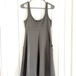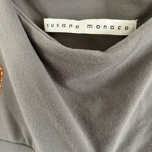 This elegant gray sleeveless Susana Monaco dress is perfect for any classy occasion. Size Medium. Its simple yet sophisticated design makes it a versatile addition to your wardrobe. Style is deep scoop neck a-line with two front pockets. Fabric is a comfy 86% Nylon and 14% Lycra. Fitted on top and a slight flow from waist down. Open back. Front pockets. Truly a stunner! Great condition.
