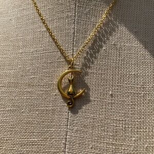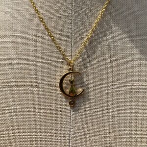 Elegant gold-tone sterling silver chain with Cat on Moon pendant necklace perfect for any occasion. Add a touch of charm to your outfit with this beautifully crafted piece.