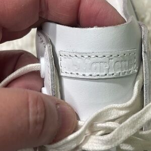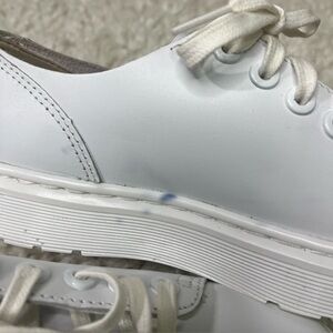 Good pre-owned condition. These have been stored against something that was blue, so there is a slight blue spot on the inner of one shoe as noted in photos. Also there is a pink "4" sticker size on the inside, but both shoes are a size 5. I didn't try to get the store and pink sticker off. Dr Marten Dante leather sneakers ladies size 5.