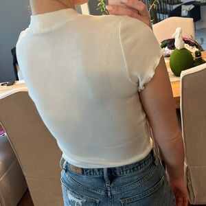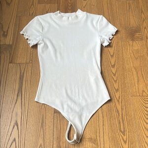 Elegant white bodysuit with ruffled sleeves. Soft and comfortable fabric. Perfect for layering or wearing alone.